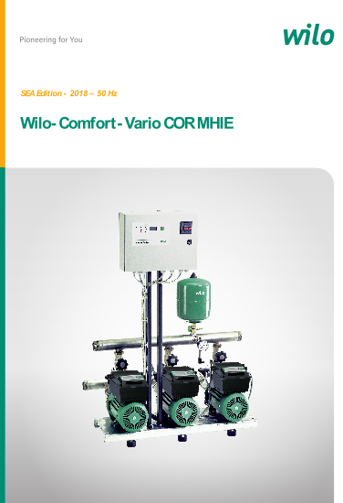 Example: Wilo-COR-3 MHIE 406/VR i COR Compact pressure boosting system with integrated speed control 3 Number of pumps MHIE Pump series 4 Rated volume flow of the single pump (m³/h) 06 Number of single-pump stages VR Control unit; VR = Vario controller